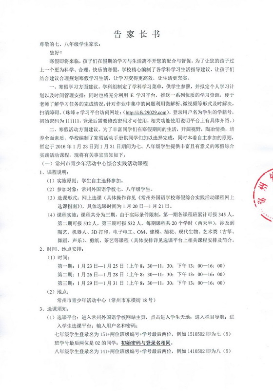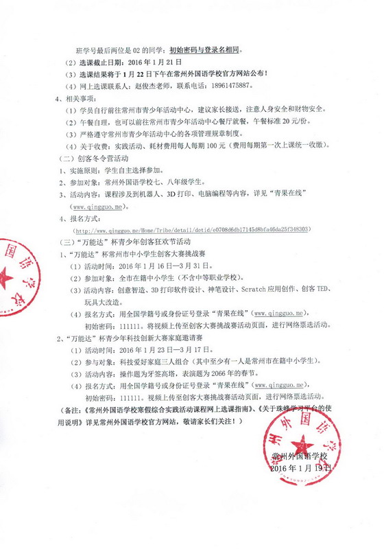 (备注:《常州外国语学校寒假综合实践活动课程网上选课指南》、《关于珠峰学习平台的使用说明》详见常州外国语学校官方网站,敬请家长们关注!)